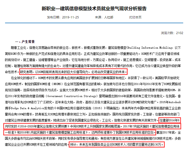 2019年11月25日,中华人民共和国人力资源和社会保障部发布了关乎BIM从业人员的一则公告:新职业——建筑信息模型(BIM)技术员就业景气现状分析报告。着重强调了对于接下来五年国内的BIM发展趋势和从业人员的薪资待遇统计,且指出未来五年我国各类企业对BIM技术人才的需求总量将达到130万,具体查看原公告: