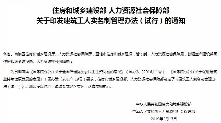 近日,住建部官网发布了《建筑工人实名制管理办法(试行)》,宣布从3月1日起,在全国范围内正式施行建筑工人实名制。《办法》同时规定:全面实行建筑工人实名制管理制度,区域建筑工人实名制管理平台与全国联网。