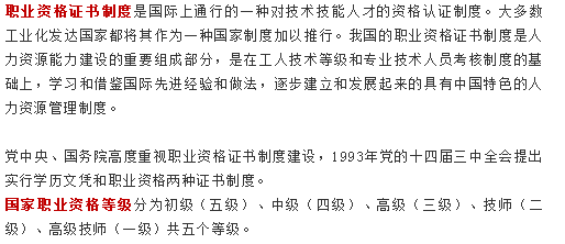 职业资格是对从事某一职业活动所必备的知识、技术和技能的评价,是技能人员和专业技术人员职业能力和水平的证明。与学历文凭不同,职业资格与职业活动密切相联,更直接、更准确地反映特定职业的实际工作标准和操作规范,以及劳动者从事该职业所达到的实际能力。