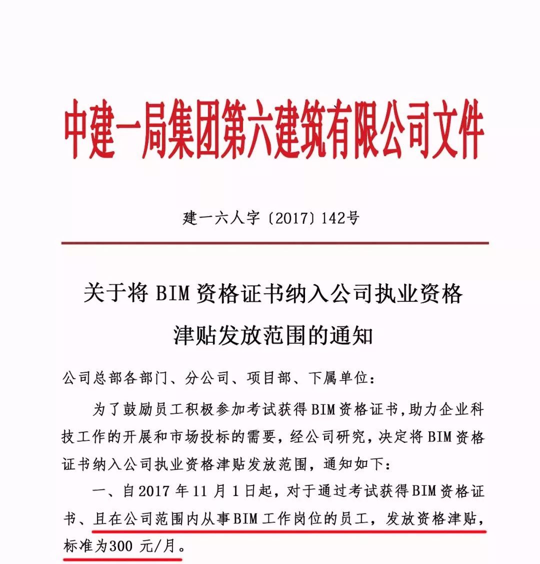 随着《建筑信息模型施工应用标准》等国家标准的正式实施,很多大型国企施工单位,对于BIM证书认可度非常高,出台了对于BIM证书的薪酬补助政策,每月均有补助。