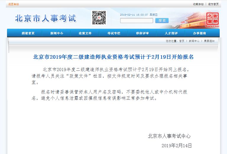 北京市2019年度二级建造师执业资格考试预计于2月19日开始网上报名,请报考人员关注“政策文件”栏目,按文件规定时间及要求办理报名相关事宜。
