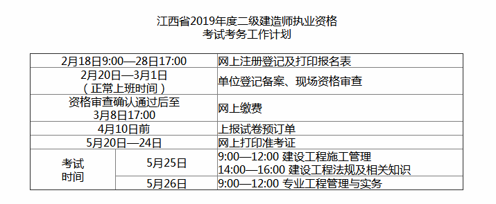2019年度二级建造师执业资格考试依据《二级建造师执业资格考试大纲》(2019年版)命题,考试时间定于5月25日、5月26日举行,具体时间和科目为: