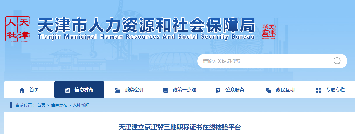 为全力建设人才强市,进一步优化营商环境,更好服务市场主体,日前,天津市人力资源和社会保障局开发的京津冀三地职称证书在线核验平台正式启用,实现人才登录一个平台就能在线核验京津冀三地职称证书信息。