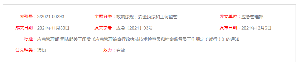 为加强应急管理部门执法专业力量建设,有效缓解基层执法队伍专业人员不足的问题,强化对行政执法工作的社会监督,促进应急管理部门严格规范公正文明执法,现将《应急管理综合行政执法技术检查员和社会监督员工作规定(试行)》印发你们,请遵照执行。